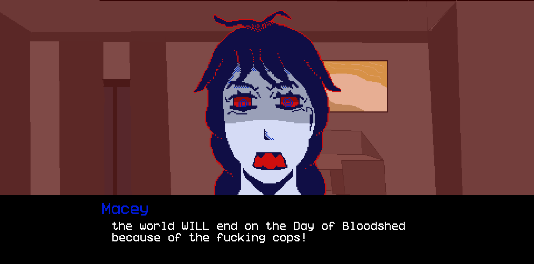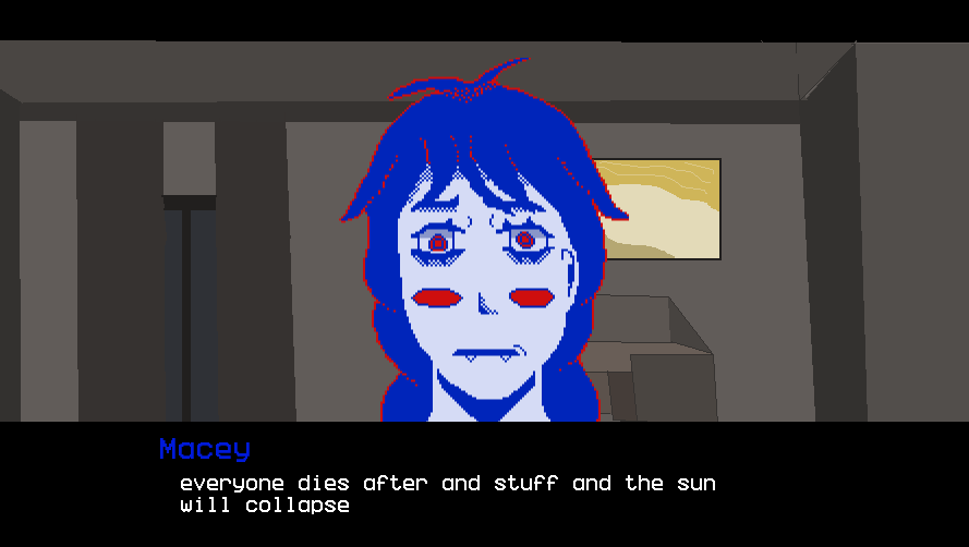 Last days is a visual novel game that pushes the player into dealing with anxiety, depression and morality and dealing with the confusing, abrupt reality that the world ends in four days.